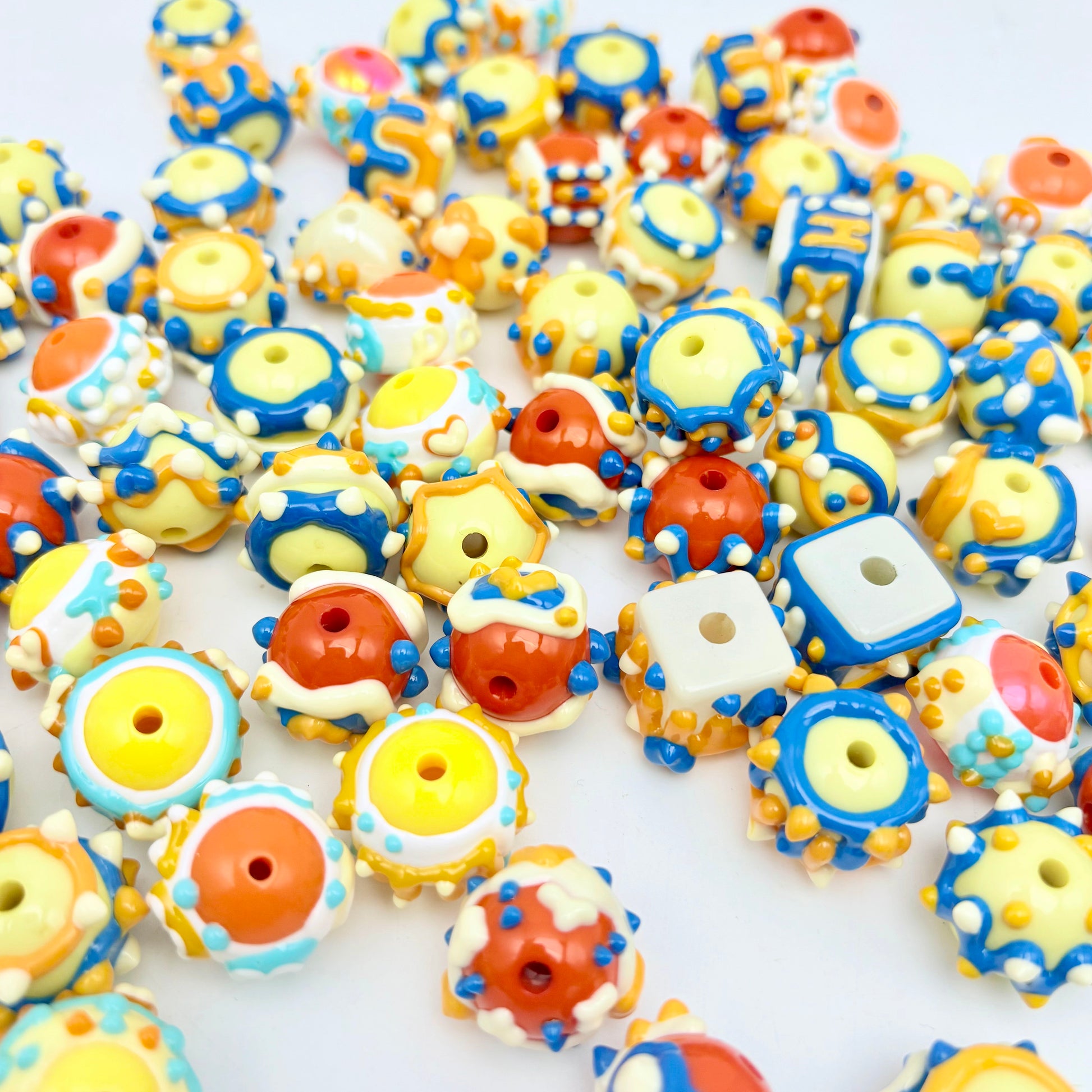 [A112]レモン黄の絵韵・黄青手描きプラスチック串珠ミックス(5 個 / 10 個 / 20 個)