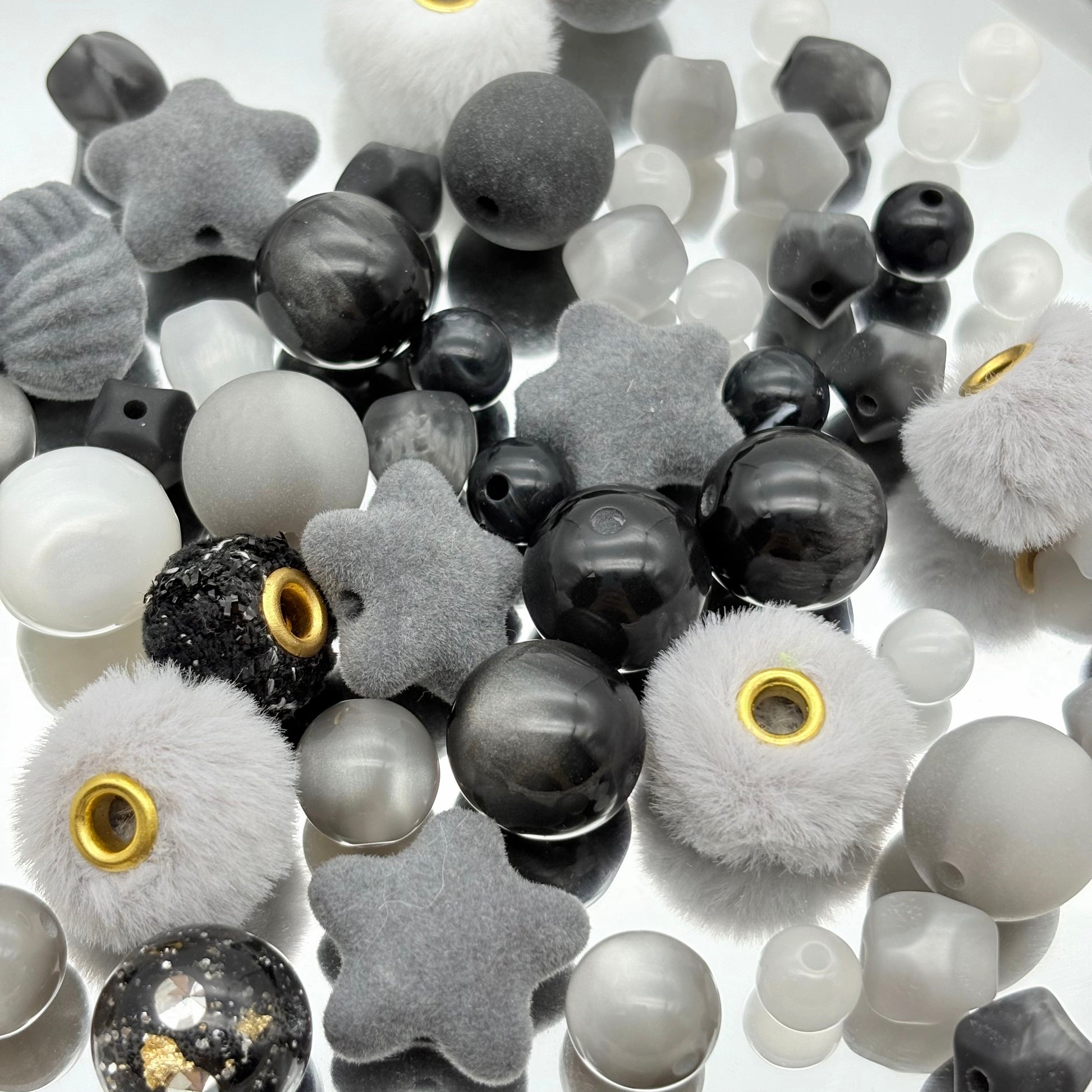 [A34]墨灰の絨星・ビーズミックス(複数素材):黒灰色柔らかなフリースビーズ 50ml/100ml